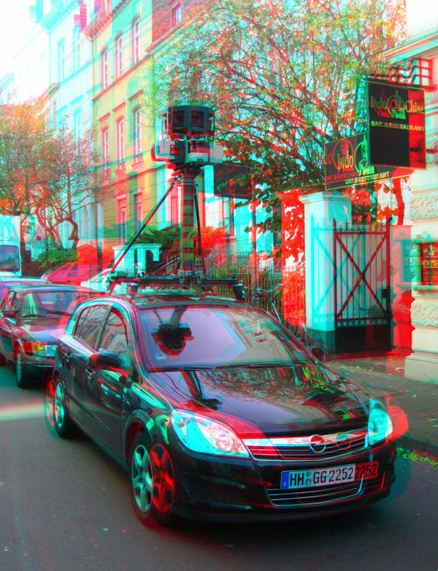 Überhaupt scheint es schwierig, Anaglyphen nicht nur am Bildschirm gut sichtbar zu machen, sondern auf Papier. Die Rot-Seite funktioniert meist gut; alles ganz Rote wird weggefiltert. Probleme macht die Blau-Seite. Dagegen hilft nur, das Papier etwas anzugrauen, abzudunkeln, und nicht hellweißes Papier als Hintergund zu nehmen. Vielleicht ist die alte Kombination rot-grün statt rot-cyan erfolgsversprechender? – Wobei allerdings »alte« Brillen nötig sind. Mehr